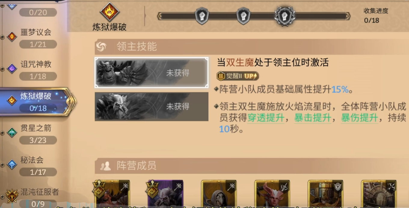目前T0档次的阵营有噩梦议会、炼狱爆破,这两个阵营主打高爆发伤害,伤害数值高出其他阵营一大截,面板属性相当出色,养成后用伤害数值就能极快速度清理怪物。第二梯队的是守望者小队和不可名者,这一阵容功能性丰富,守望者小队能够提供不错的援护效果,在前排上也能战场,前期开荒作用非常舒适,而不可名者主要是各种减益buff效果突出,持续战斗优势很大。T1级别的有北境王座,主要是获取容易,卡池分布广泛且在前期具有不错的属性,能打能抗。