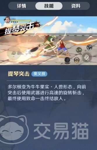 这种强大的冲击力可以让敌人难以抵挡,当玩家点击普攻键时,多尔顿会进行额外的冲撞攻击,给敌人造成更大的伤害,同时在冲撞过程中,多尔顿还可以闪避飞行道具的攻击,当多尔顿的普攻进行到第四段下砸攻击后,他的技能形式还会继续发生改变,而多尔顿的奥义技提琴突击,这项技能让多尔顿能够变身为牛牛果实·人兽形态,向前突击后使用武器进行高速的旋转斩击,随着旋转速度的不断加快,最终达到极值时多尔顿会使用致命一击。