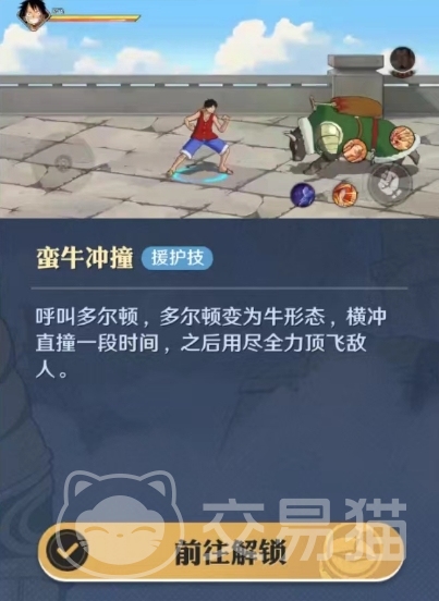在跃起前,玩家还可以通过方向键调整跳跃的方向,这使得多尔顿的攻击更加灵活多变,同时在跃起过程中,多尔顿还可以闪避飞行道具的攻击,这进一步增强了他在战场上的生存能力和战斗效率,当多尔顿的普攻进行到第四段下砸攻击后,他的技能形式会发生改变,多尔顿的技能二兽形态也是有形态上面的变化,这项技能让多尔顿能够变身为牛牛果实·兽形态,向前方横冲直撞,期间可以用摇杆控制方向。