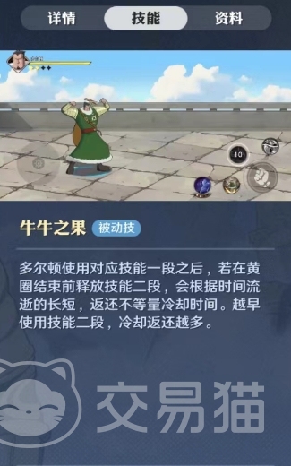 在战斗中多尔顿的援护技蛮牛冲撞是他的杀手锏之一,这项技能让多尔顿能够变为牛形态,横冲直撞一段时间,用尽全力顶飞敌人,这种强大的攻击力和震撼的视觉效果也让他在战场上可以先手直接控制住对方,发起有效的连击,多尔顿的被动技牛牛之果也是他的一大特色,这项技能让多尔顿在使用对应技能一段之后,若在黄圈结束前释放技能二段,会根据时间流逝的长短返还不等量的冷却时间。