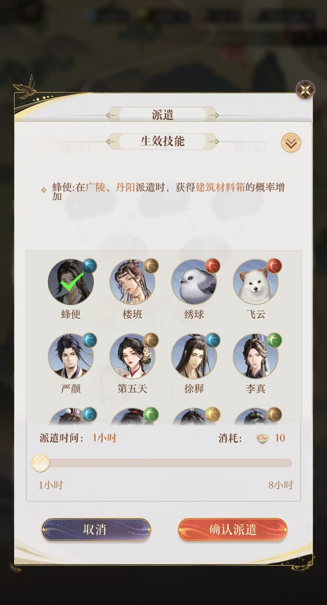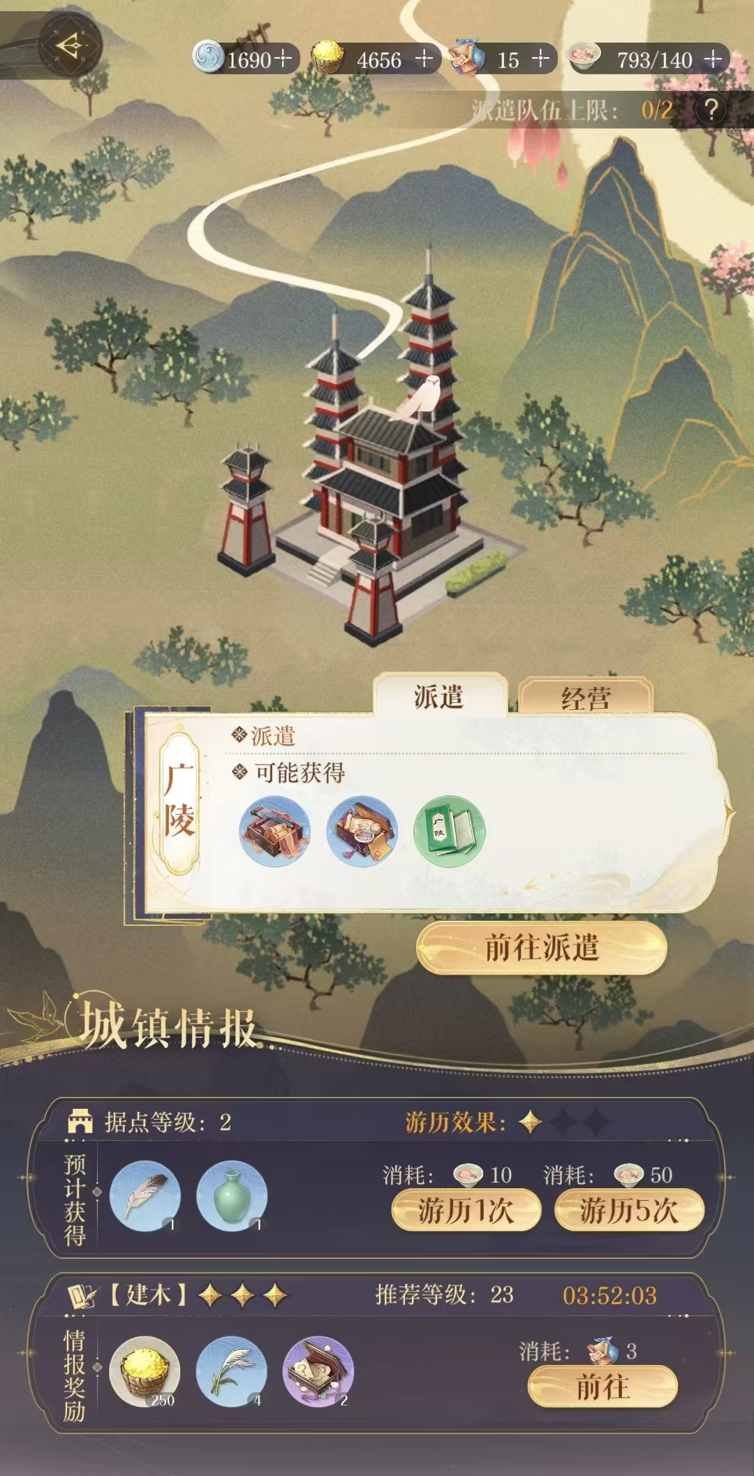 派遣玩法在游戏中就是选择符合要求的密探,进行派遣为玩家收取资源。派遣的时间越长获得资源越多但是消耗的体力值也多,1小时10点体力值玩家可根据资源多少选择。目前在游戏中最推荐的据点派遣是洛阳,因为洛阳派遣能够获得少量的白金币和鸟食。