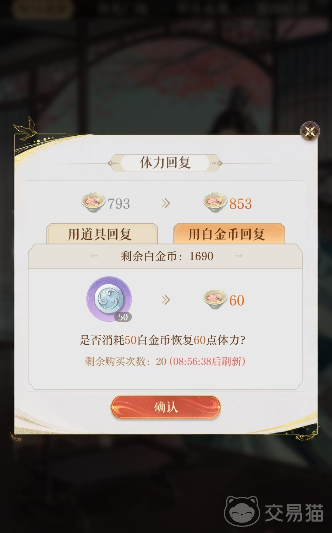 50白金币购买60点体力,一天最多能够购买20次。白金币是在游戏中玩家抽取up角色的关键货币,小编不是很推荐玩家使用这个方式进行获取哦!如鸢体力获取渠道 和玩法就到这里和小伙伴们分享结束!