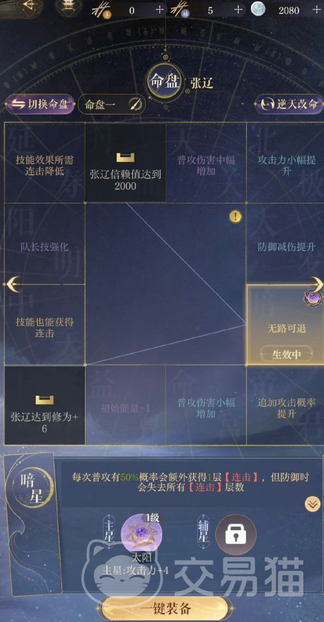 具体打法思路与上一套相似,要确保在14回合以内打出80%血量的斩杀线,张辽与马超都是新卡池的强势密探,但是只有一星的情况下,练度必须在修为11左右。同时为了让张辽多打伤害,命盘要技能减1能量与技能算连击,如果能够刷出无路可退有50%几率额外叠连击,还可以加快回合数。郭嘉既是有克制关系的风属性,也可以赌合击,如果有奇袭计,可以叠加普攻免伤,这样就能更稳定通关。