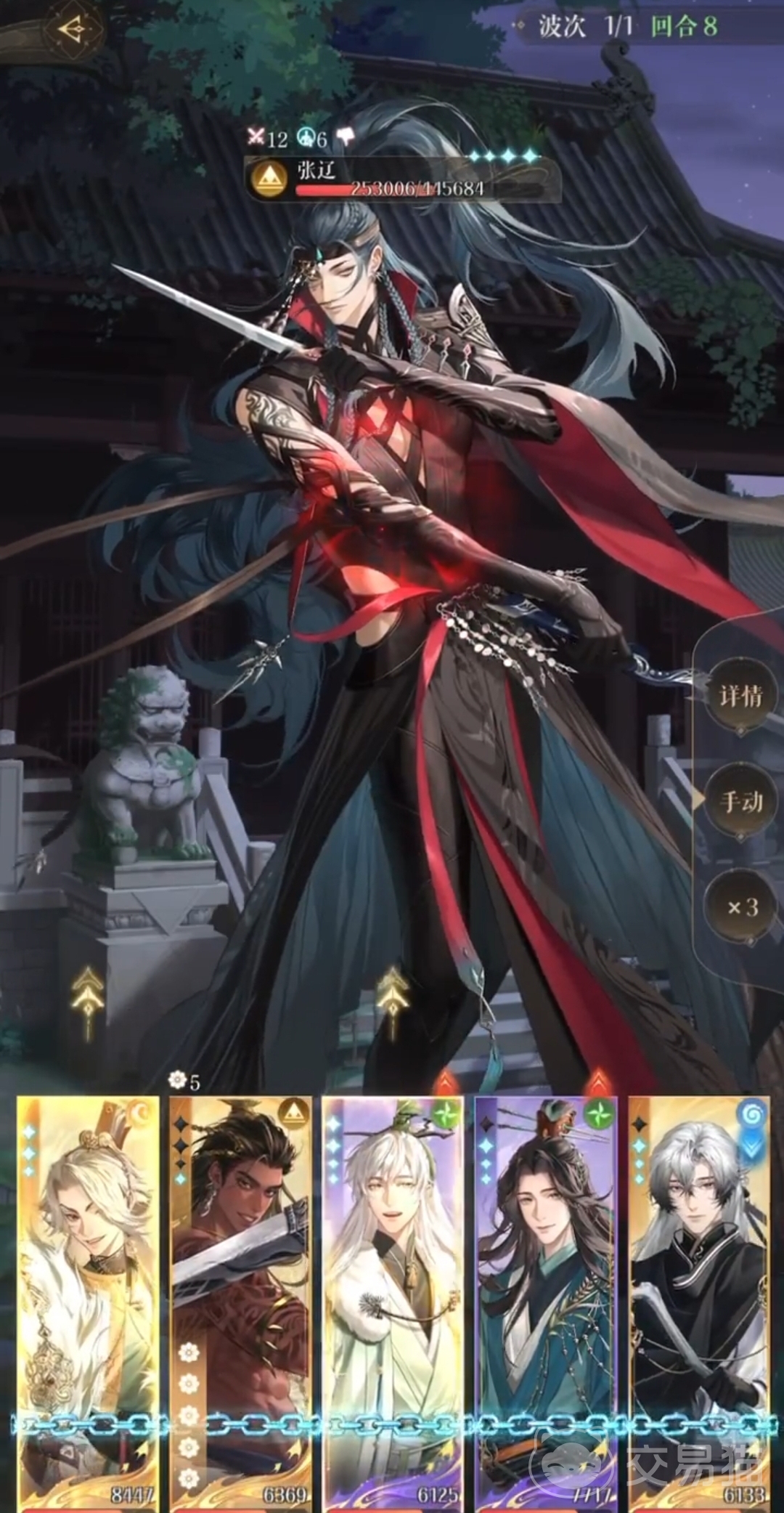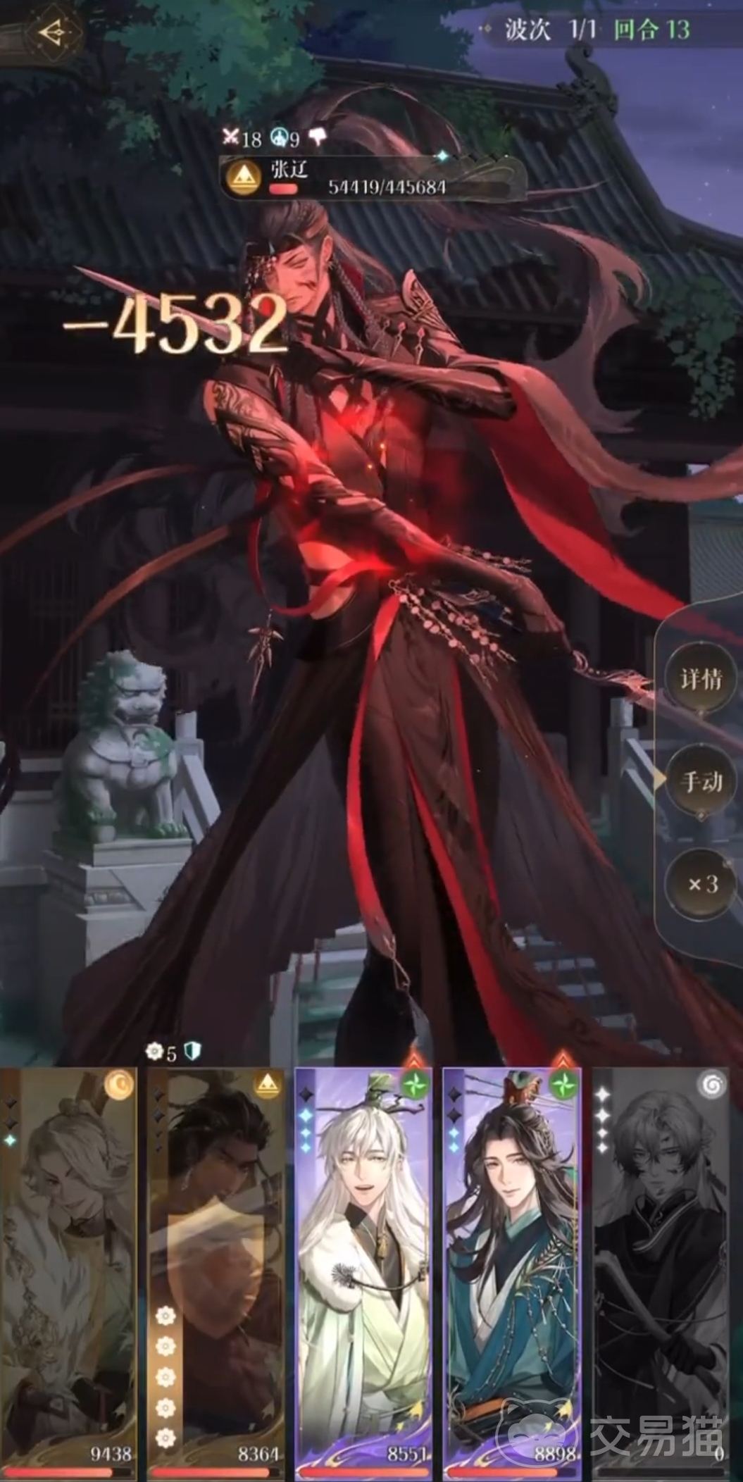 第13回合以后是收拾残局的阶段,玩家场上至少要留两名大招能量即将满的输出角色,在2选1献祭环节,优先让没有大招能量的离场。小编比较建议留杨修到最后,因为他的大招3能量配上陈登打火比较快,还能够赌一个双数暴击,提前结束战斗。