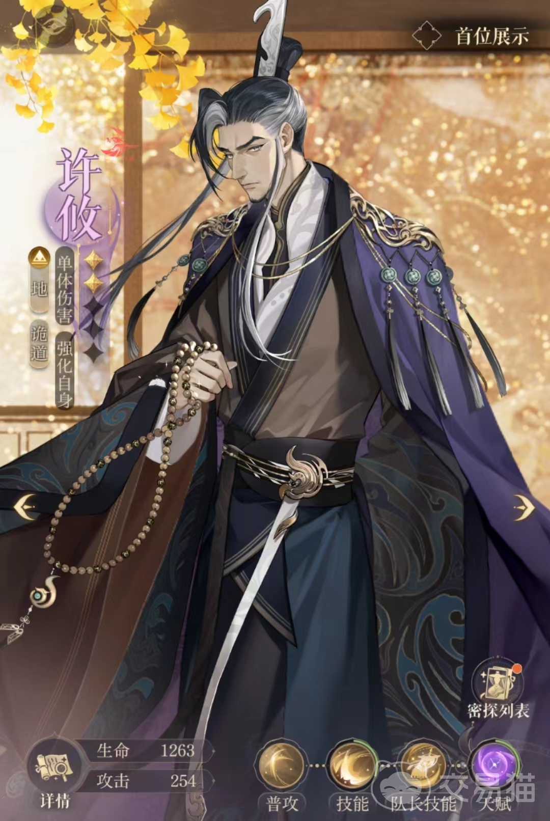 许攸是一个拥有单体伤害技能的角色,一般来说可以用来刷各种关卡,比如据点任务,还有历练等等,让他和阿婵一起,大家过关的速度会快很多,所以资源丰富的小伙伴可以考虑养一养这个角色。