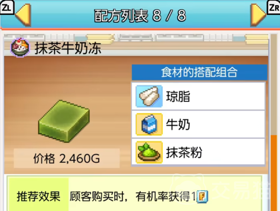 如果大家更喜欢抹茶牛奶冻的话,便可使用牛奶琼脂以及抹茶粉。共同合成一个抹茶牛奶冻,若将其成功卖出的话,还有一定的概率获得一个“f”。能够帮助你解锁新的菜单,又能快速打造更多的分店。