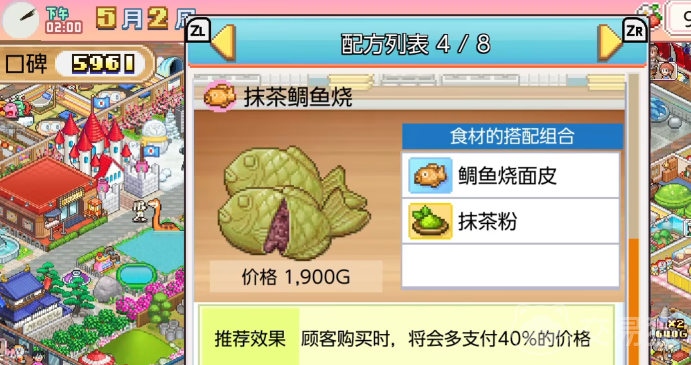 另外还有特别的菜式—抹茶鲷鱼烧,是由抹茶粉加上稠鱼烧面皮所制作而成。有着外酥里嫩的口感,造型也特别别致。若是顾客顺利购买后,那便可多获得40%的酬劳。虽然该食材比较难找,但是所获得的回报很大。