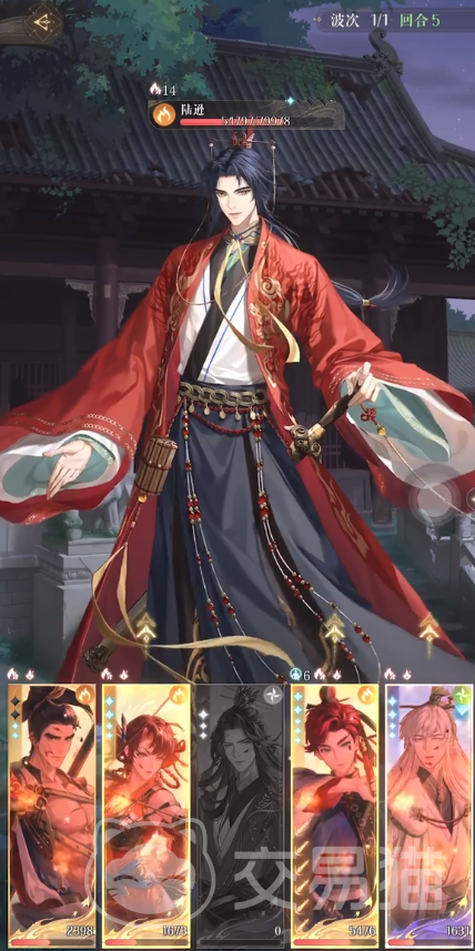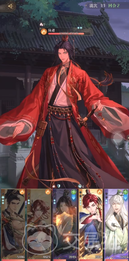 第5回和孙权、孙尚香有大招就直接放,配合史子眇的回血大招,可以将血量抬回。第5回合开始陆逊的攻击位置就变成4号位置的孙权,因此他要在本回合防御。