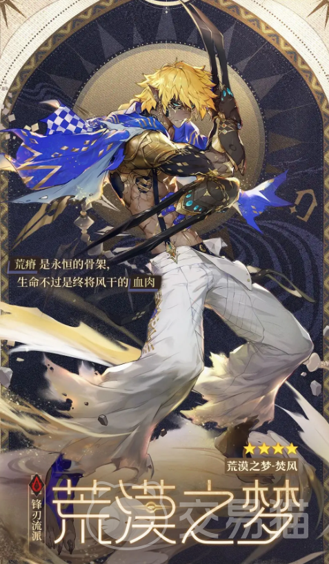 焚风的普攻会进行四段式的小范围攻击,前面两段会进行二连爪击,第三段则可以将敌人挑飞,第四段变成本体旋转爪击,每次攻击都会给敌人增加一层流血;他的生存技在使用会可以进行三次闪现,每次都能给自身充能,且上线的期间处于无敌状态;他的生存技在使用后会开启覆沙形态,全身都会被沙尘覆盖,这个状态下攻击速度会大幅度提升,普攻的前两段也会变成释放沙龙卷,将敌人控住。