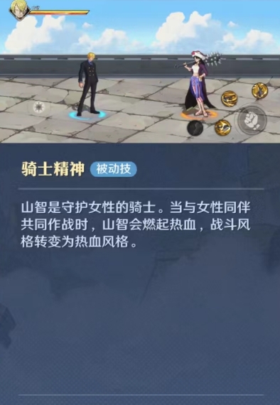 很多观众在看动漫的时候会喜欢山治的骑士精神,这也让他成为了女性同伴的坚实后盾,他不仅是草帽一伙中的厨师,更是一位守护女性的骑士,当与女性同伴并肩作战时,山治的内心会燃起无尽的热血,他的战斗风格也随之转变为充满激情与力量的热血风格,但是这是人设,技能上面目前没有体验出来这一点,在战场上,山治也是有不错的战斗技巧。