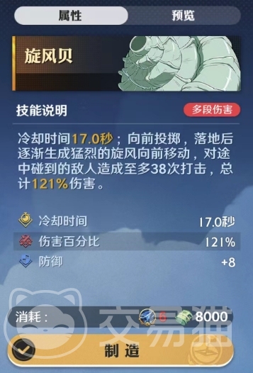 游戏中玩家可以通过获取空岛贝碎片来制造和升级空岛贝,从而提高空岛贝技能效果和基础属性,这些技能可以在战斗中使用,并且在阵容界面可以选择不同的空岛贝技能,首先推荐的旋风贝是一种非常实用的空岛贝技能。它的冷却时间为17.0秒,可以向前投掷并逐渐形成猛烈的旋风向前移动,在途中碰到的敌人将受到至多38次打击,总计造成121%的伤害,这个技能非常适合给多个角色搭配使用,可以有效地清理敌人。
