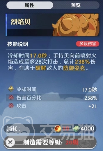 最后烈焰贝也是一种多段伤害能力的空岛贝技能,冷却时间同样为17.0秒。当手持烈焰贝向前喷射火焰时,会对敌人造成至多28次打击,总计238%的伤害。这个技能不仅具有高爆发的伤害输出,还可以有效破解敌人的防御姿态,当敌人进入防御姿态时,头顶上会显示带数字的盾牌图案,攻击命中敌人相应次数可以打断敌人的防御姿态。