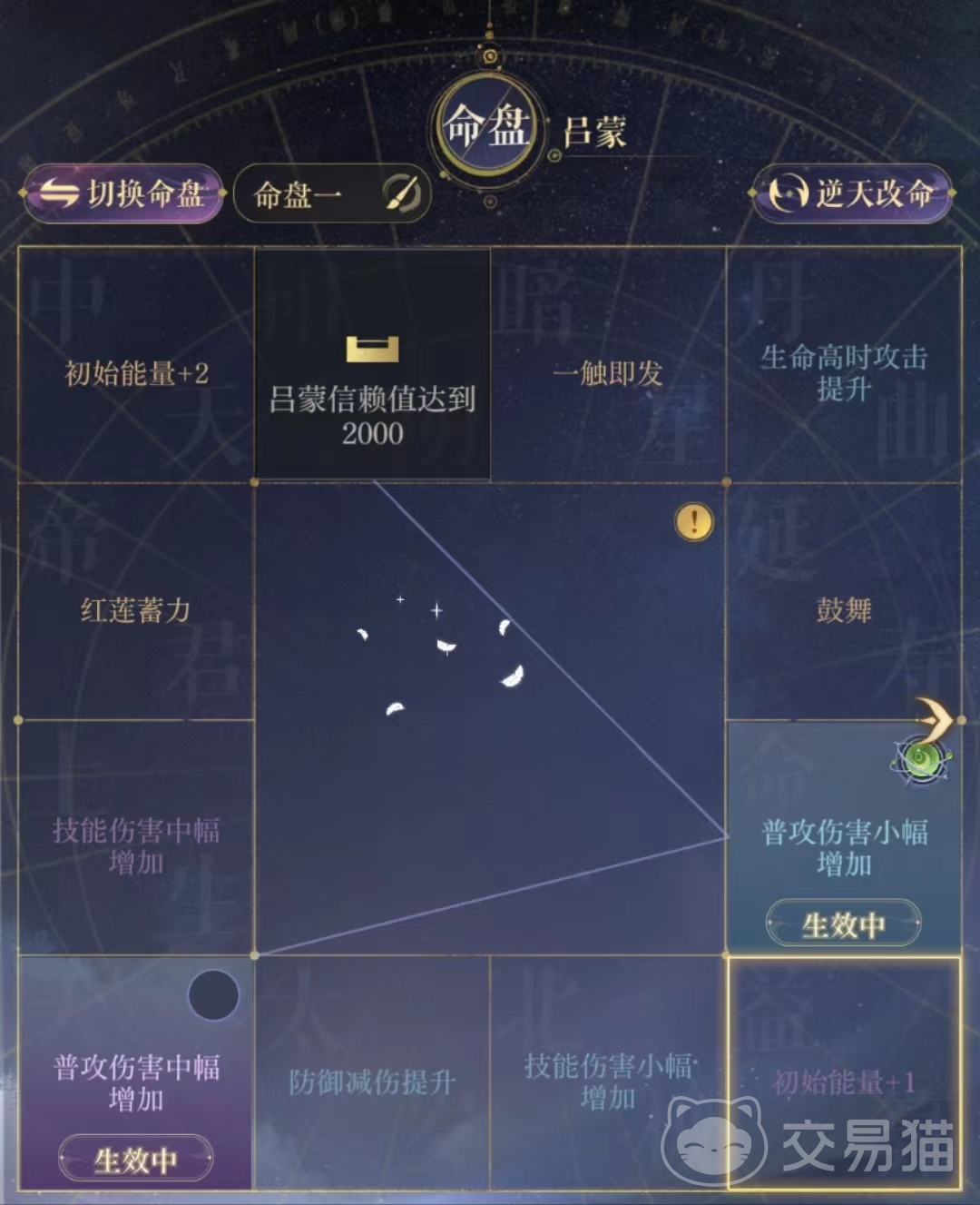 吕蒙的命盘性价比最高的是鼓舞和一触即发,这两个基本上都要点的,如果大家队伍的输出不够,还可以点一些输出方面的宫格,不过目前很多小伙伴们并没有解锁全,基本上是解锁了哪个用哪个。