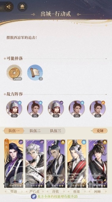 而3-13是出城行动二,主要就是大家得在平津郊的位置去摆脱西凉军的追击,除了有追兵外,还有一个长水校尉是需要大家去征服的,值得一提的是,追兵的等级都很高,36级,并且个水属性,一个火属性以及一个阴属性,所以大家在战斗的时候,队伍的配置上,地、阳属性是关键,能有效的对其进行压制。