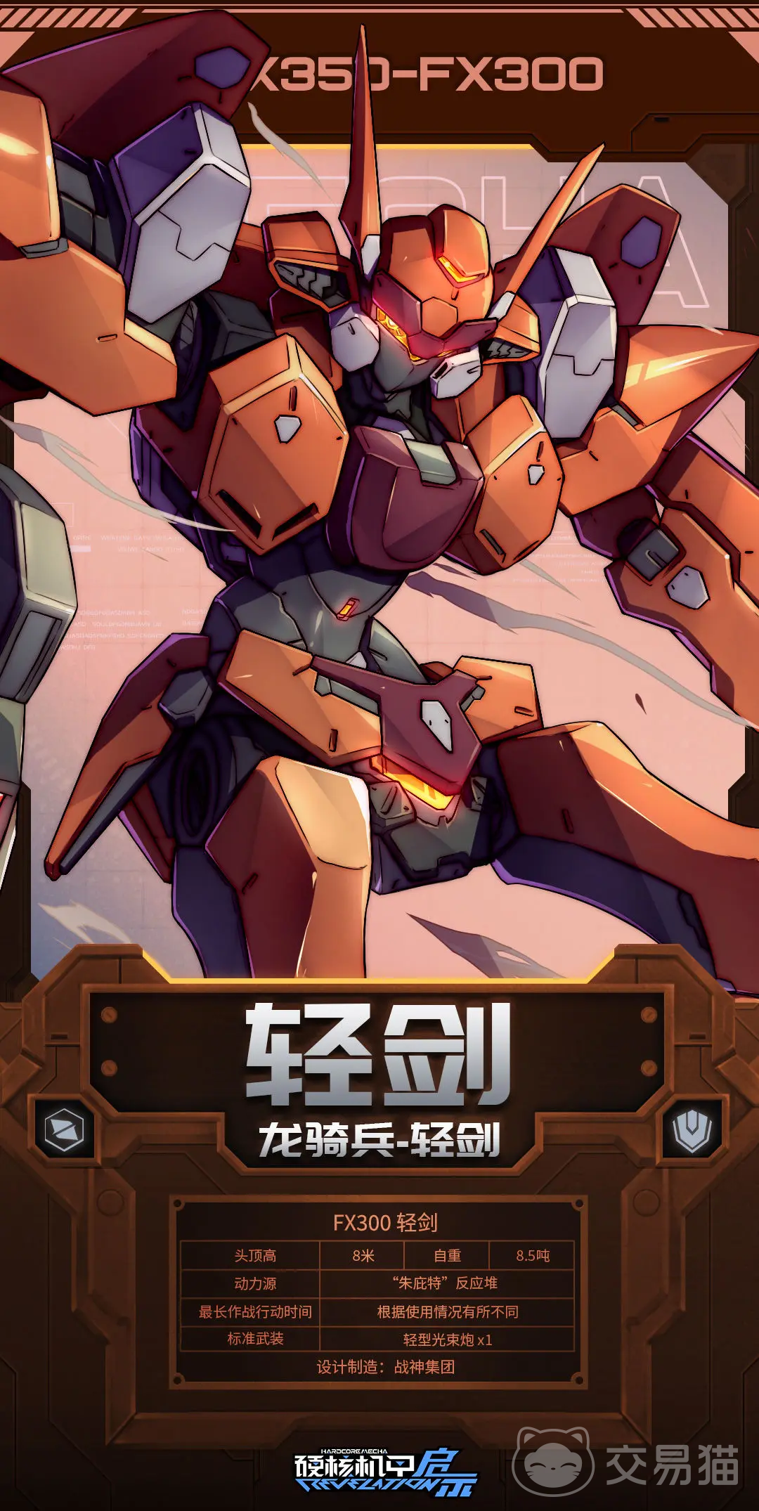 它是一台复合型的重装机甲,拥有绝佳的防御能力,以及优秀的火力。是驱除体系的SSR机甲。拥有“借机攻击”的特性,特性的机甲对瘫痪状态的敌人造成伤害时,会延长该敌人持续瘫痪的时间,适合对瘫痪的敌人全力输出来终结战斗。被动技能“脱壳”,会让它的射击伤害与防御力提升,在受到致命伤害时,会引爆外壳脱出,将自己转为轻剑形态。