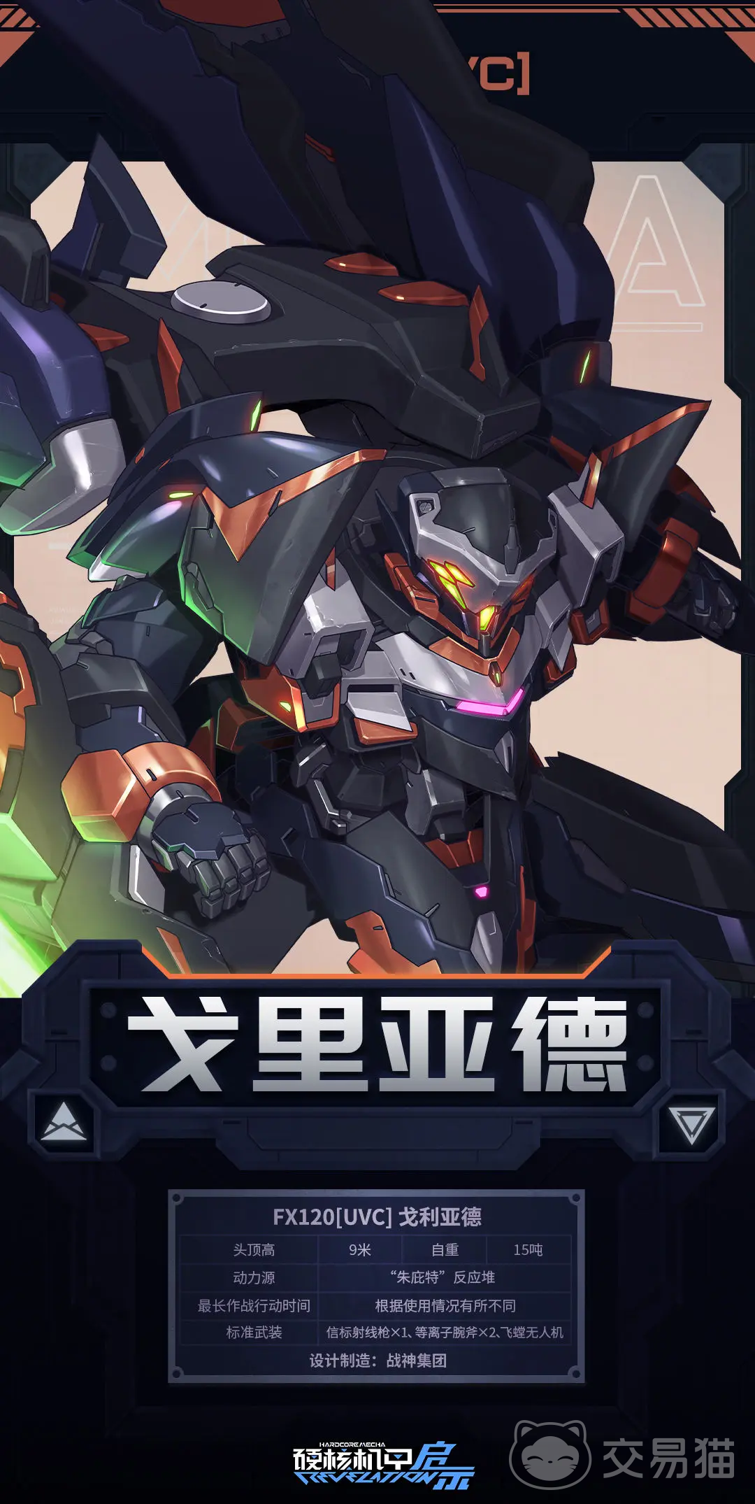 戈里亚德是一个SSR的压制体系机甲,它是一台可以协同无人机进行作战的泛用性机甲,在战斗中利用激光指示无人机集火攻击,可以利用数量的优势掌握战斗的节奏。具有“团队充能”的特性,特性的机甲在前台战斗时,小队后台的机甲也将获得必杀技充能,擅长提高小队全体战斗效率。可以对敌人进行多段攻击,可谓是十分强大的机甲。