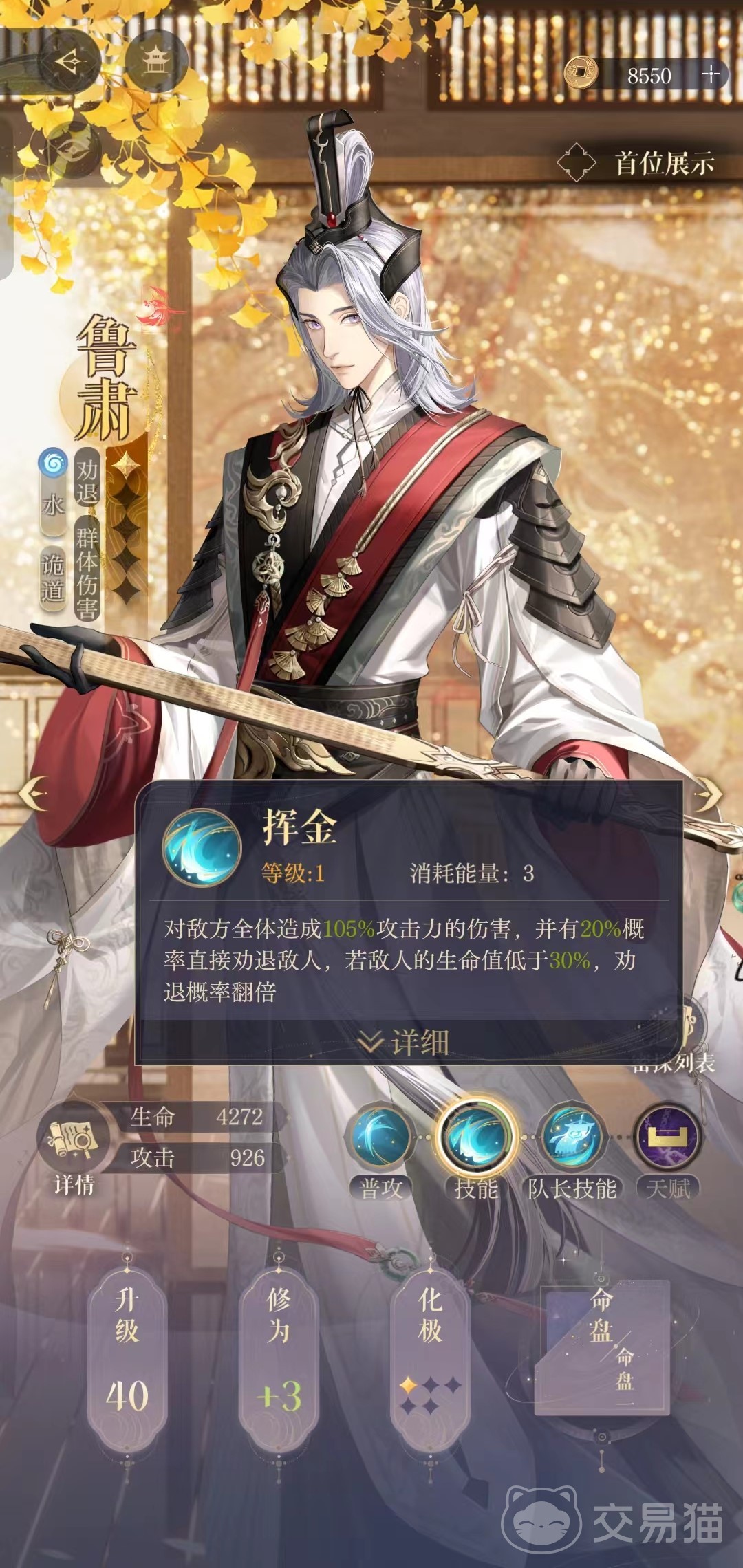鲁肃的技能名为“挥金”,是一个非常强有力却看运气的技能。“挥金”会对所有敌人造成105%的伤害,并且有20%的几率可以劝退敌人。如果此时敌人的血量低于30%,劝退敌人的成功率将会提升至40%。每当“挥金”技能提升一个等级,“挥金”对所有敌人的基础攻击都会增加5%,最多可以造成115%的伤害。