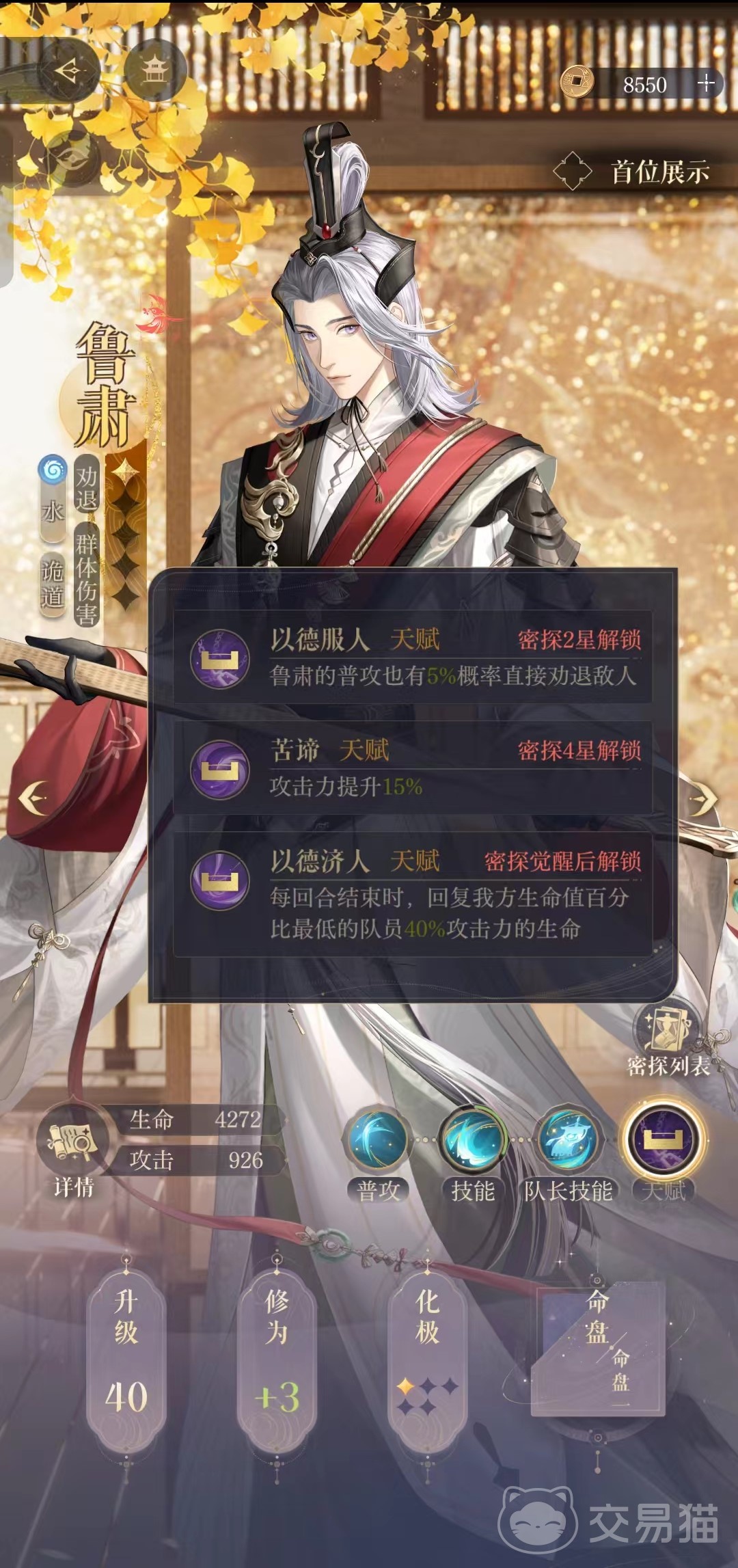 在《如鸢》里,我们可以通过密探面板得知,鲁肃是一个水属性的诡道角色。可以克制火属性的角色,但也会被地属性的角色所克制,具有较为强大的群体攻击和收割的能力。作为游戏初期十连必得的角色,鲁肃在游戏初期可以在许多关卡对我们起到一定帮助。