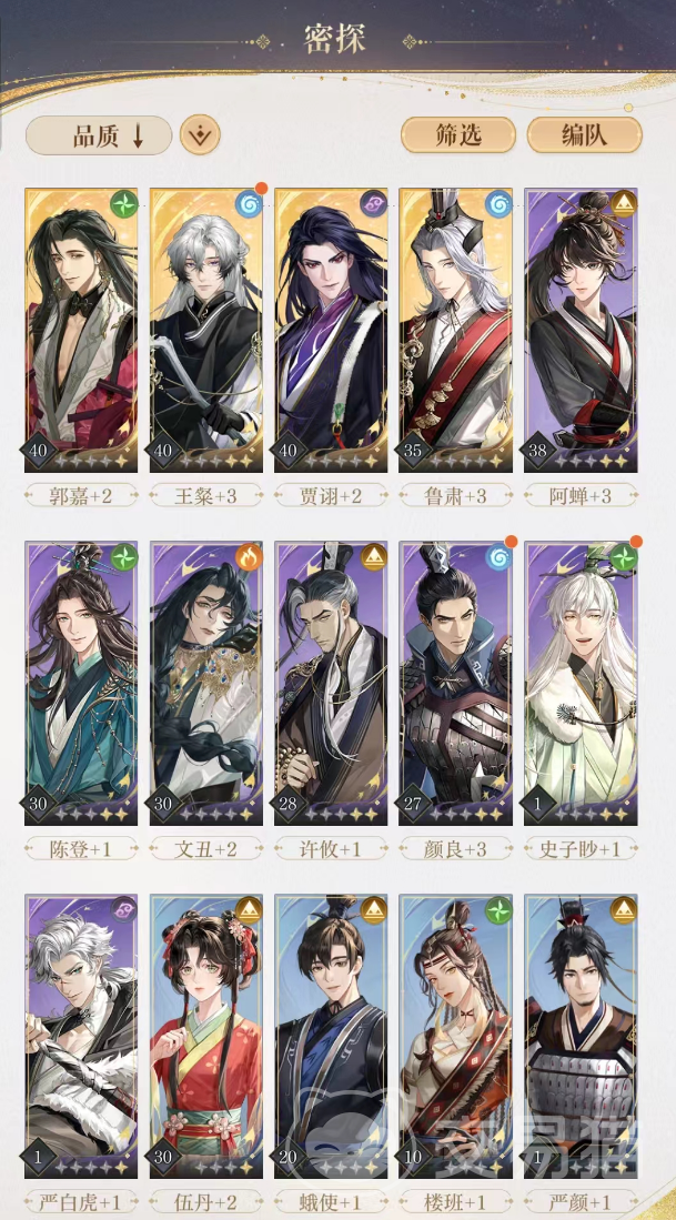结合鲁肃“挥金”技能的特点,我们可以选择杨修、陈登等英雄来搭配,提供必要的控制和支持。鲁肃和杨修相组合可以在实战中为队伍提供额外的辅助效果,增加队伍的整体实力;鲁肃与陈登的组合可以提前释放大招来尝试劝退战斗中的BOSS,例如主线剧情第五章的头领等,这种搭配比较适用于想要快速通关的玩家。如果要侧重于鲁肃“劝退”的使用,我们也可以选择陈登、郭解、颜良等角色进行搭配使用。这个阵容的优点是每个角色的获取方式都相对简单,很容易从招募的常驻池里抽取到,但相对来说也有因为陈登在30级时需要修改本命图,存在队伍伤害不稳定的缺点。