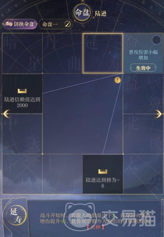 特别值得一提的是在这款游戏当中,陆逊拥有三个命盘,和其他的角色是一样的,在游戏的初期会拥有一个自带命盘,而且他两个命盘则需要玩家进行修为的提升提高与角色的亲密度达到两千就能够自主开启剩余的两个命盘。