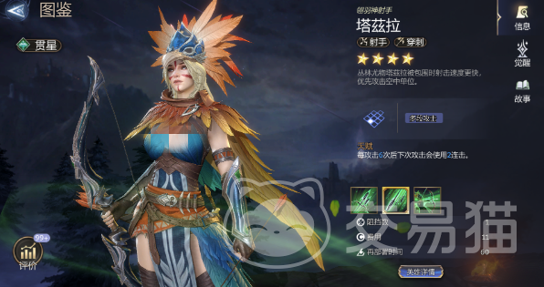 第二个角色同样是一个四星级角色,塔兹拉是穿刺型射手,每六次攻击完成后都可以使用两次连击,而且自身的蓄力时间并不是特别的长,可以在早期直接使用。玩家可通过传说精粹和神话精粹来获得纹章来帮助该角色实现更为高效的境界提升。而达到三星级以上这个角色就可以实现觉醒,从而提高角色的战斗能力。不过需要注意该英雄角色的上限是五次。