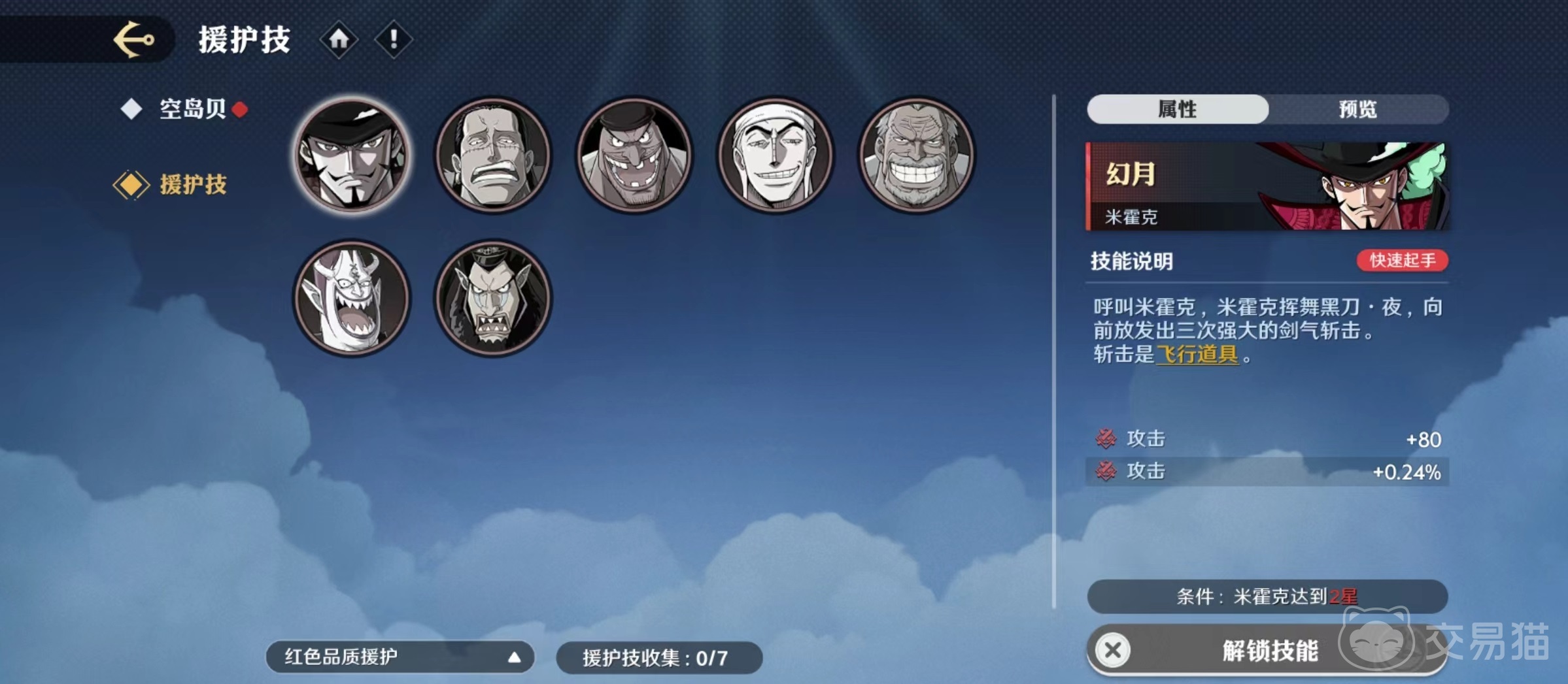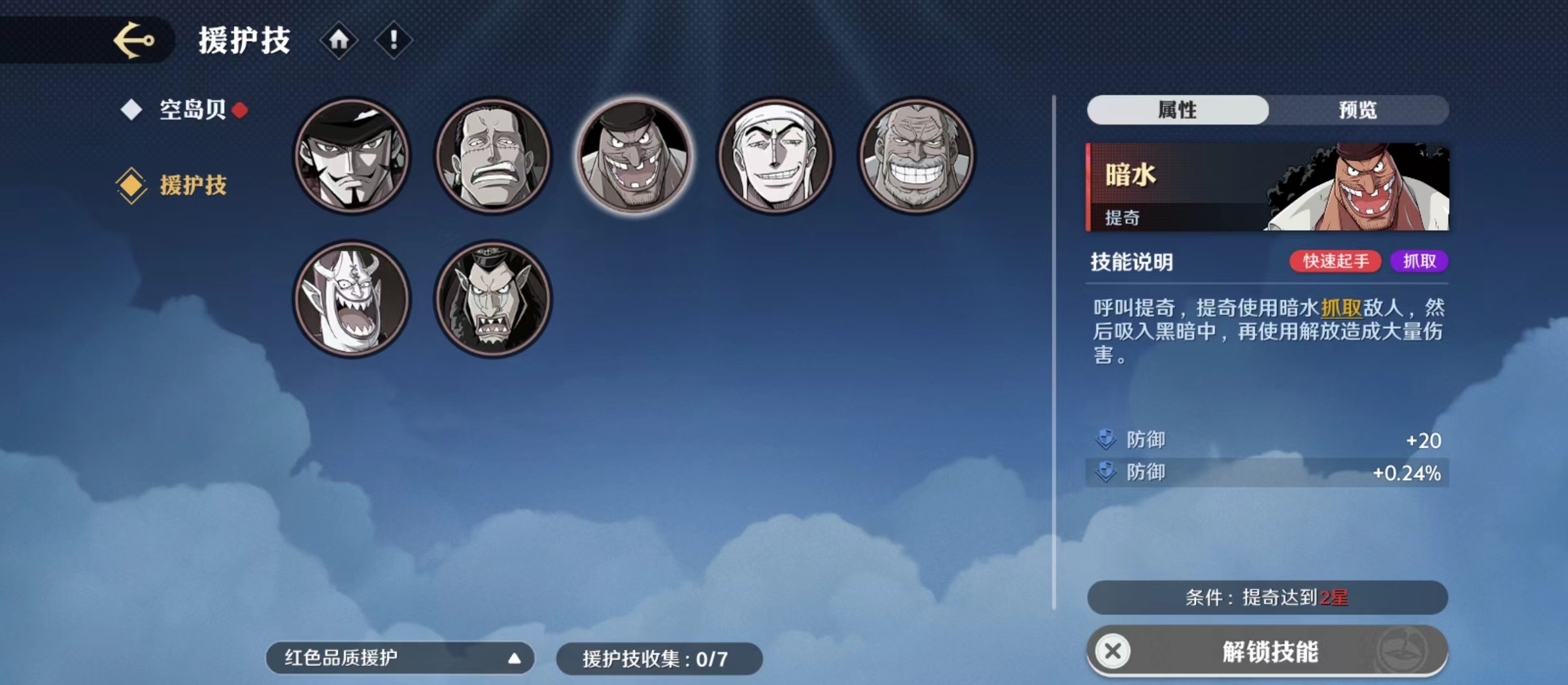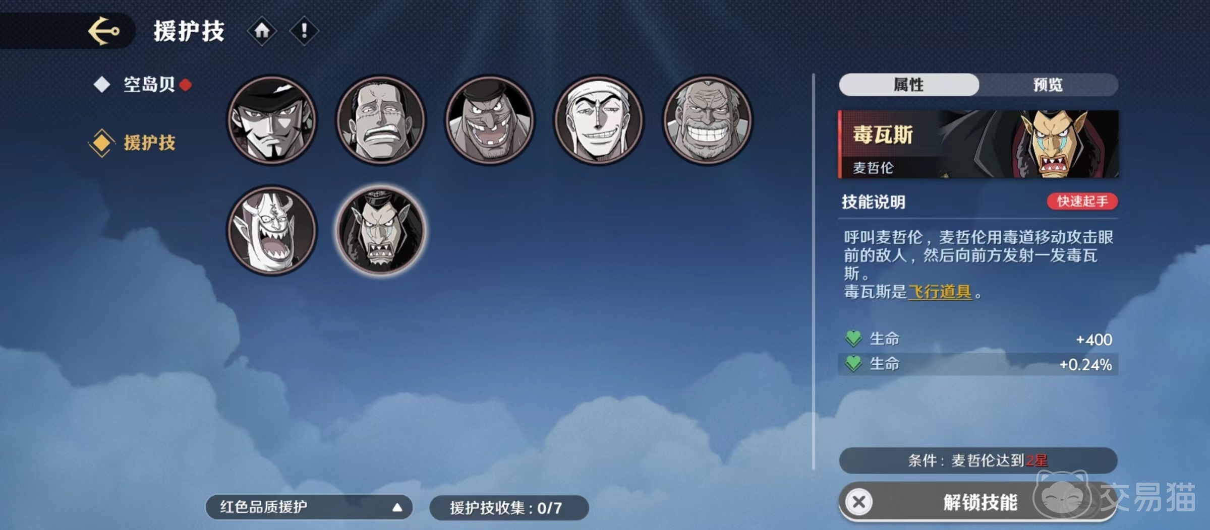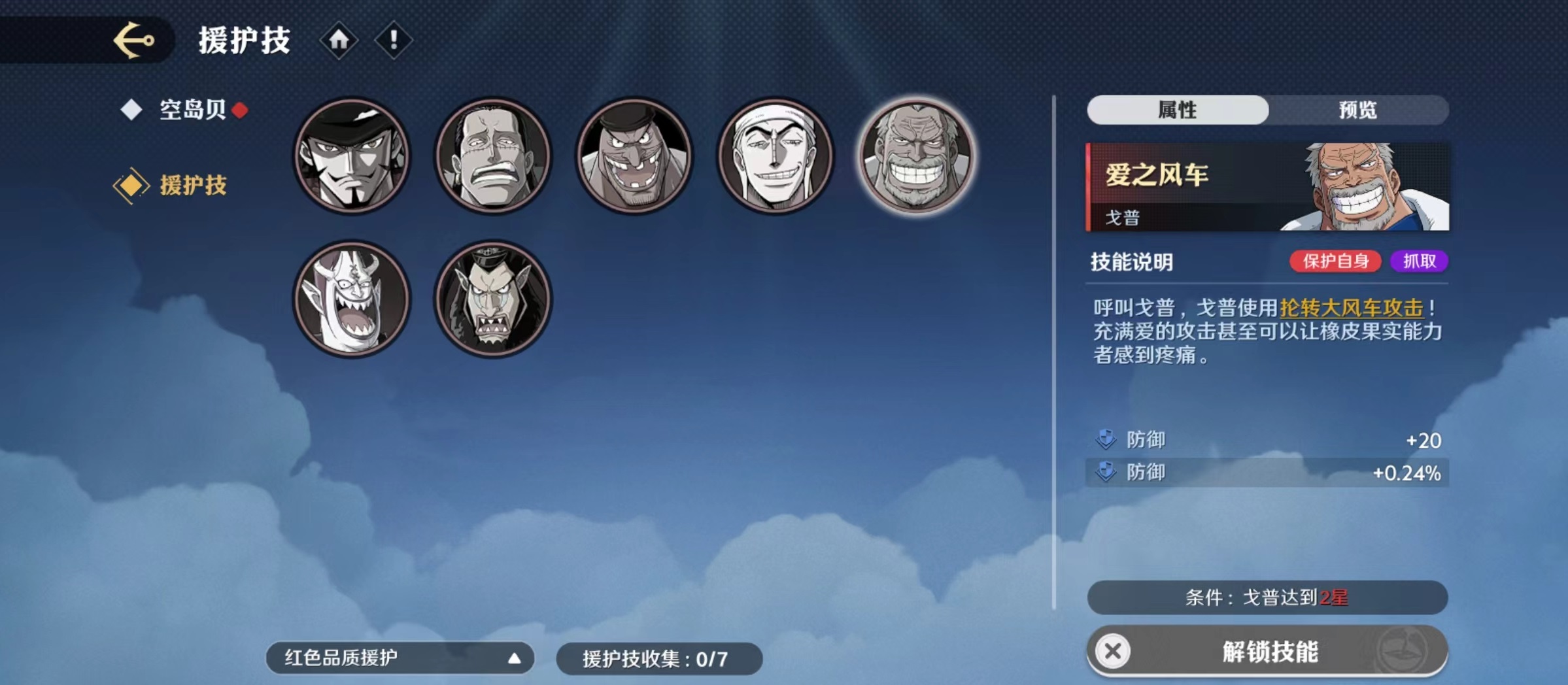 第4个是戈普的援护技能爱之风车,戈普使用大风车攻击场上的目标,即使是橡皮果实能力者也会感到疼痛,装备后增加防御。第5个是莫利亚的技能影法师,莫利亚勉强同意派出影法师予以支援,影法师打出的攻击属于飞行道具,装备后增加攻击力。最后一个是麦哲伦的毒瓦斯,麦哲伦用毒道移动攻击眼前的敌人,并向前方发射一枚毒瓦斯,装备后增加生命值属性。