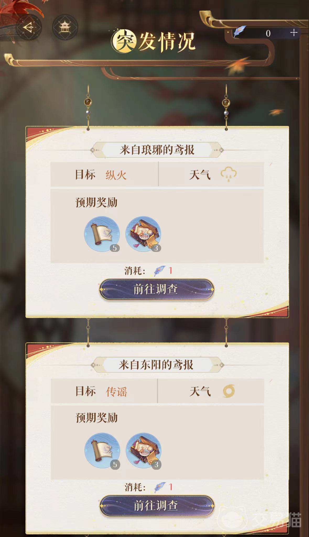 漆园蝶的获取方式主要是通过鸢报中的突发情况获得,每天有两次免费的机会。因此漆园蝶的数量不多,建议每张都用在刀刃上不要白白浪费。