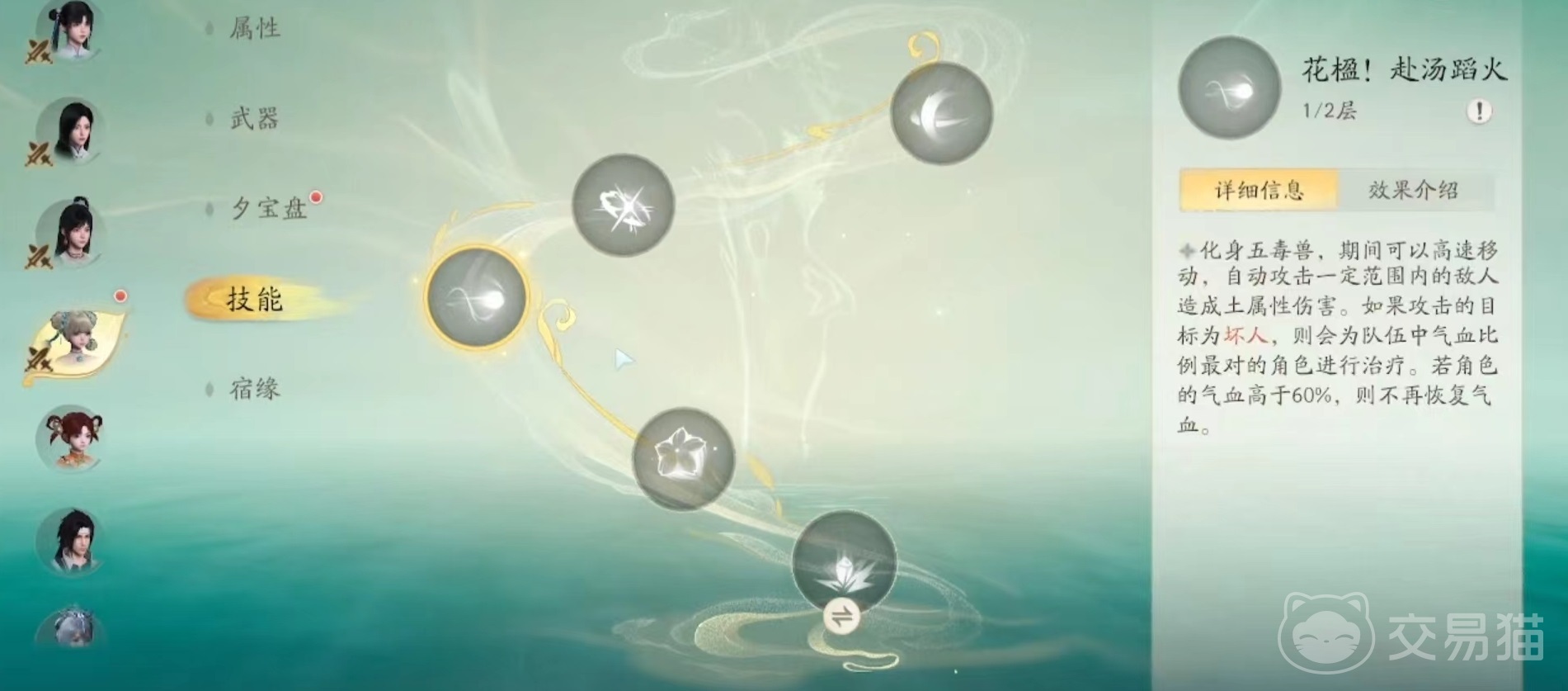第2个技能花楹赴汤蹈火,化身为五毒兽形象,在此期间能高速进行移动,对范围内的敌人进行自动攻击,造成土属性伤害。如果攻击的目标带有坏人标签,则为队伍中血量最低的角色进行治疗。第3个技能弱袂迎春,进行四段攻击造成土属性伤害,通过长按技能可以化身为五毒兽向前方撞飞目标,并为其添加土灵元素和坏人标签。第4个技能飞岩术,从高空砸下巨大的岩石造成范围伤害,根据土资质效果,岩石数量还会进一步提升。