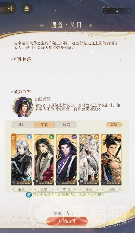 首先进入匣椟并选择前往挑战后,你将被直接传送到Boss山贼首领的场景,这一关卡中有两个主要的Boss,它们分别固定攻击2号位和4号位,红衣首领是其中之一,他对敌方4号位造成300%攻击力的伤害。如果无法选中敌方4号位,则会选择顺序下一位的目标,他的普通攻击对敌方4号位造成100%攻击力的伤害,如果仍然无法选中敌方4号位,则会选择顺序下一位的目标。