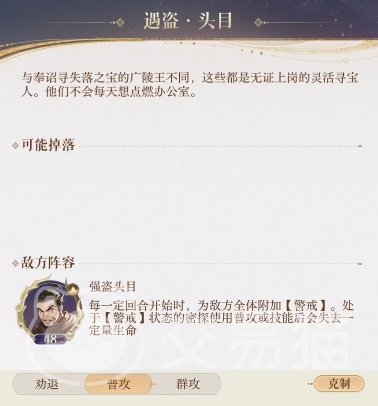 在命盘方面,陈登可以开启2能量,或者用杨修利用他自带能量来赌开局,这样操作起来十分方便,如果阿婵的伤害不足,那么就需要其他输出角色来提升练度,至于命盘中的陈登,完全可以使用初始状态,无需额外培养,在这个挑战中,玩家需要面对一个特殊的敌人强盗头目,这个敌人具有一项独特的效果,每经过一定的回合数,他就会为敌方全体附加一种名为警戒的状态。