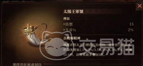 太阳王军号能提升角色2%的生命和15的防御,它的效果是当佩戴者对友军进行治疗时,有概率让其伤害提升10秒,该效果可以叠加三次,这个神器也是辅助专用的,适合哪些加血频率较高的辅助使用。