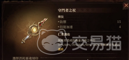 守门者之杖能提升角色15的技能防御和4的技能加速,它的效果是让佩戴者造成的过量治疗概率转换为护盾,这个就非常适合辅助去用,因为有些时候加血的时候,队友血量消耗并不大,这能让辅助溢出的治疗不被浪费,让队伍的生存能力提升。