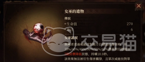女巫的遗物同样能提升角色270生命值和6点专注力,它的效果是让佩戴者通过威能技对敌方造成伤害的时候,有概率对目标施加2级减防状态,降低对手的防御能力,这让我们能打出更高伤害,在战斗中更加强势。