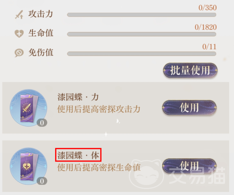 就算要投,也是在马超扛不住的时候再去给他喂一些加血量上限的漆园蝶,其他时候用不上。漆园蝶数量有限,尤其是加攻击和加血量的,这些都要规划好用在哪个密探身上,而不是说因为某个密探需要某个属性就给他用。