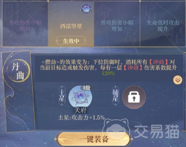 而马超的命盘中关键性的命盘有“铁骑当千”,下拉防御获得高额护盾,但自体获得流血。“出手法”,技能不嘲讽但全体增伤提升15%。“以攻为守”,下拉防御的时候消耗冲劲来触发伤害。“西凉铁壁”,最大血量提升,触发增伤提升。