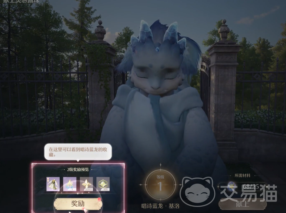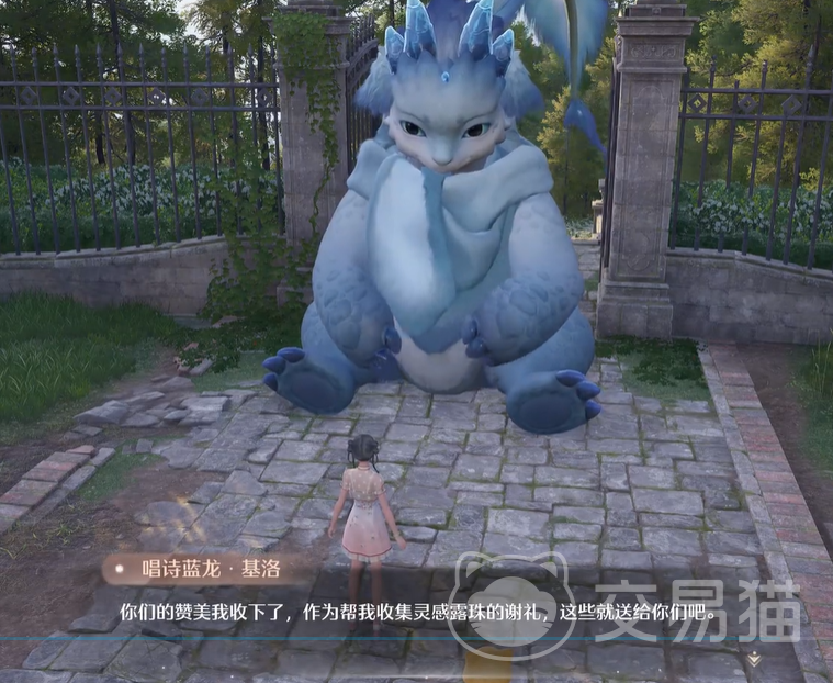 而玩家则需要为这个蓝龙寻找灵感,让它可以制作出理想的诗歌,这时候就需要收集三个干净的灵感露珠,这个露珠是比较容易获取的,玩家们在做主线的剧情中会看到很多亮闪闪的晶体,这些晶体便是灵感露珠,大部分玩家应该都拥有10几个的露珠,这时候玩家们贡献露珠即可,当然庭院的周围也是有一堆的露珠是可以拾取的。