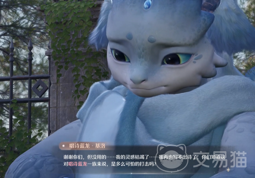 这时候进入庭院以后就可以正面看到蓝龙,看起来是比较失落的,这时候玩家们需要在剧情中大声喊叫蓝龙,这个蓝龙才能彻底苏醒,但是蓝龙似乎不太愿意配合,因为自身没有任何的灵感去创作诗歌,使得魔力不断流失。