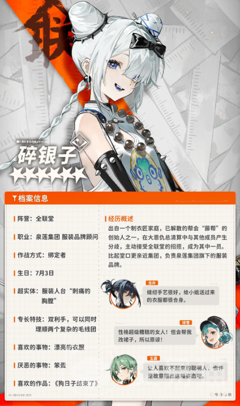 碎银子来自于一个制衣匠的家庭,在一场帮会的大清算中与其他的成员产生了不一样的意见,但也成功复仇了。所以她就主动接受联堂伸出的橄榄根,并成为了其中的一员。她是一个很好的模特,不管穿什么衣服都很漂亮。特别是她的衣服定制能力,但是在帮会中收到了大量的好评。