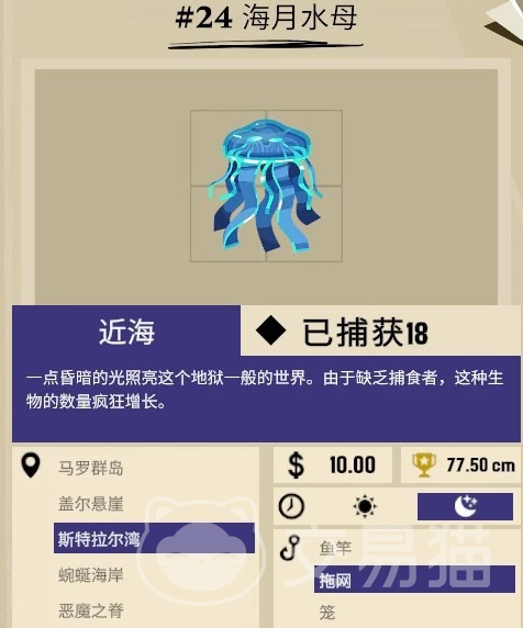 斯特拉尔湾的鱼类比较多,接下来介绍几个比较有代表性的鱼类,首先第一个是海月水母,这个水母非常的漂亮,但是玩家们只可以在近海的晚上才能捕捉到它,我们只能用拖网捕捉,笼子和鱼竿都是无法获取到它的。