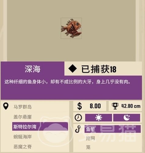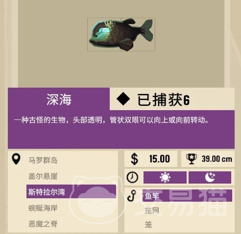 管眼鱼,这个也是一种深海鱼,也是这个海域比较多的鱼类,它的获取难度不是很高。狮子鱼,这个鱼类只能在海沟进行捕捉,本身的捕捉难度不算低,玩家们需要提前做好准备才可以将其钓上来。