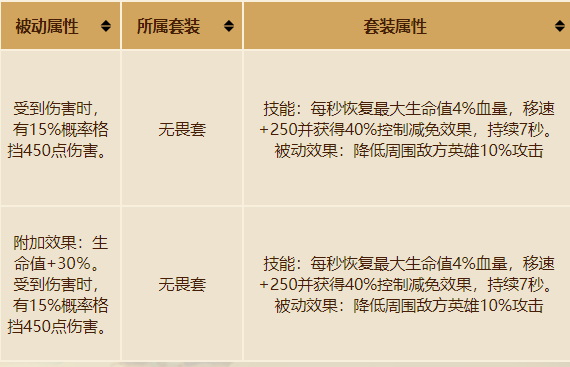 除此之外,当这两件装备穿戴期权时还将触发额外的特殊属性。每一秒将会恢复4%的血量,移速增加250,并且将获得持续7秒的40%控制减免效果。如果你的周围有敌人的话,那么敌方所有角色的攻击力将会降低10%。综上所述,无畏套装的属性是非常不错的,对于血量比较少的玩家来说有奇效。