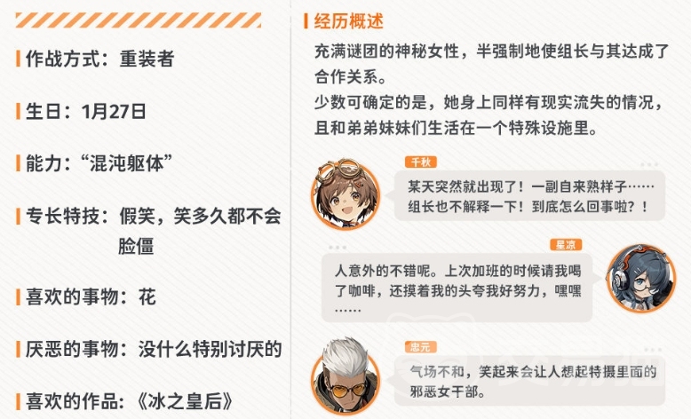 她在剧情中因为有一定的实力所以让组长不得不与她达成合作关系,尽管关于她的过去和真实身份仍有许多谜团未解,但可以确定的是,她也面临着现实流失的困境,并与弟弟妹妹们一同生活在一个特殊的设施之中,结的大招,也就是她的超限技能,是她战斗能力的核心体现,当她施展这一技能时,会对全部可选敌人造成惊人的物理伤害,具体数值为49.98%、99.97%和150.04%。