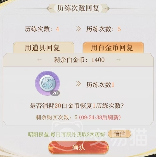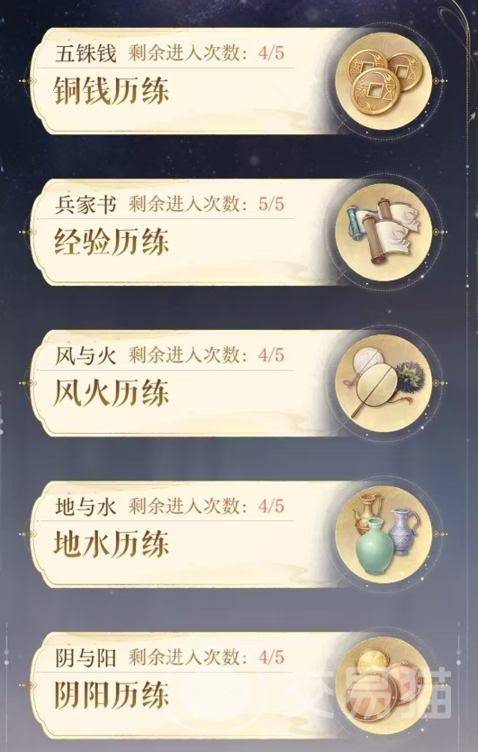 首先大家需要了解在游戏中,历练玩法总共分为5种类型的材料关卡,分别是铜钱历练、经验历练、风火历练、地水历练和阴阳历练,这5种材料关卡分别对应着不同的奖励和道具,是玩家获得铜钱、经验以及密探突破升级道具的关键副本,每种模块的历练次数每日为5次,但玩家可以通过使用道具来回复历练次数,每日最多可额外获得一次。