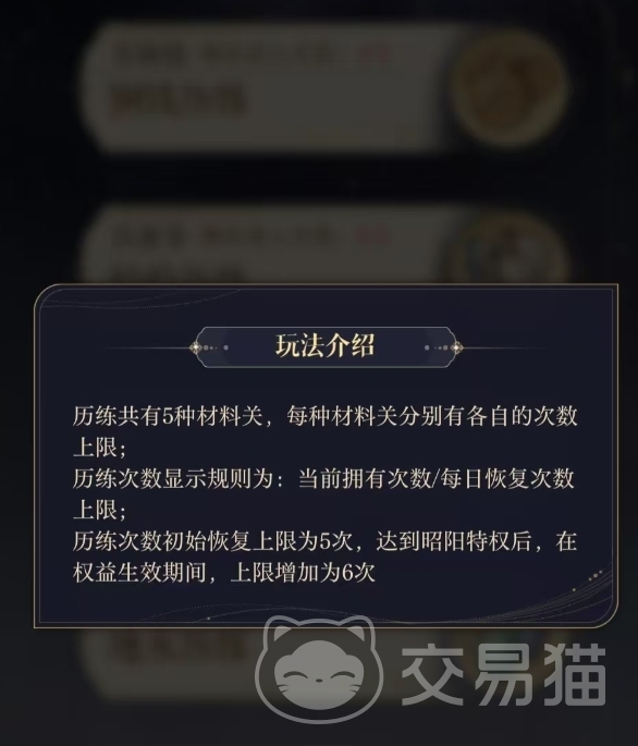 当玩家解锁朝阳的权益后,所有材料关卡每日会额外获取三次历练机会,各个材料关卡的具体奖励是不同的,铜钱历练关卡主要是让玩家获得3万的铜钱,这对于玩家在游戏中购买各种物品和道具非常有帮助,经验板块的历练则是让玩家获得兵书残卷,该道具能够增加密探的经验值,帮助玩家更快地提升密探的等级,风火板块的历练主要是让玩家获得风火两种属性密探的突破材料。