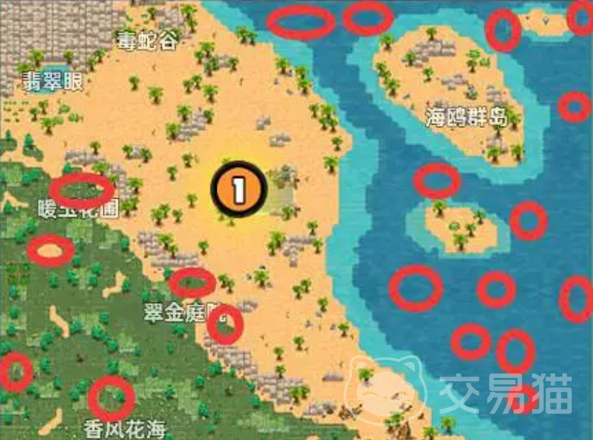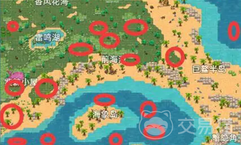 在搜索完上半张地图之后,小伙伴们就可以继续看下半张的地图了,不难看出实际上在翡翠海岸这张地图里大部分的宝箱都是聚集在下半张地图的,并且也非常密集,这大大的降低了小伙伴们搜索的难度。首先大家可以前往雷鸣湖的右边搜索到几个宝箱,然后往下走到紫荆小屋,这里的宝箱数量也是比较多的。最后在海象岛的附近也隐藏着几个箱子,过这边的箱子,需要小伙伴们绕着这个岛来进行搜索。