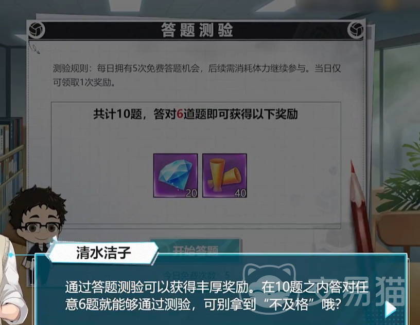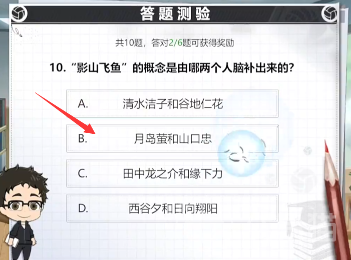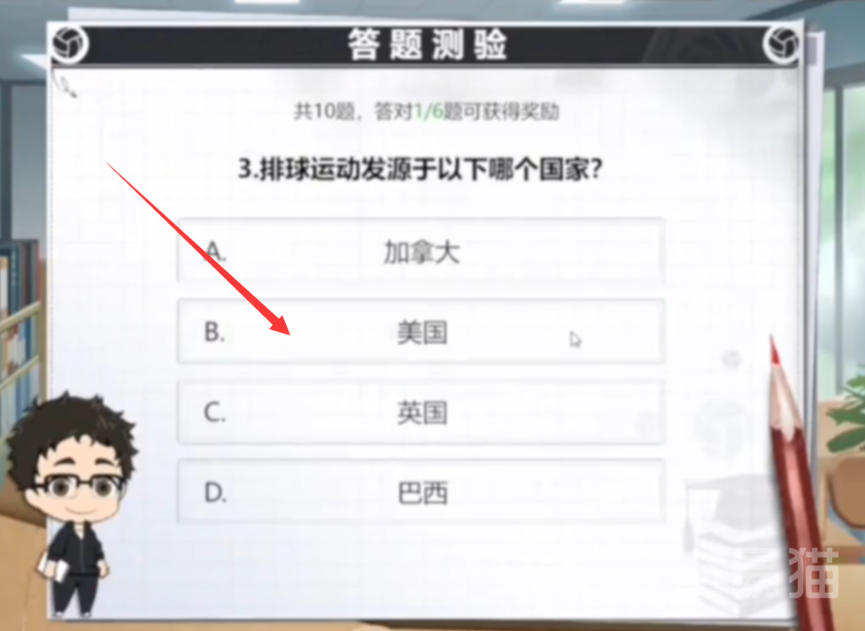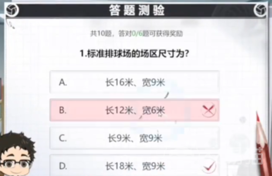其实这个任务还是属于福利向的,总共会为玩家发布十道选择题,选对六道题即可完成挑战,拿到丰厚的奖励。玩家需要熟悉排球少年的基本玩法规则、战术以及原著中的漫画故事背景。可以通过参与游戏中的排球知识问答、查看角色的背景故事来积累知识。只有对排球少年有深入的了解,才能在答题时迅速准确地给出答案由于题目全随机,接下来小编挑几个比较难的问题分享给大家: