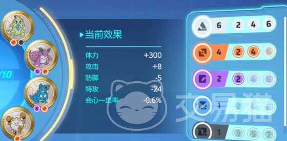 徽章的话,可以选择袋龙,比雕,烈雀,尼多后,尼多王,火爆猴,暴鲤龙和肯泰罗。这些徽章总共所加的属性非常适合月伊布,它可以增加300点生命值,攻击+8。虽然会降低一些防御,特攻和会心一击,但我们本身就不是输出类型的宝可梦,所以没关系。