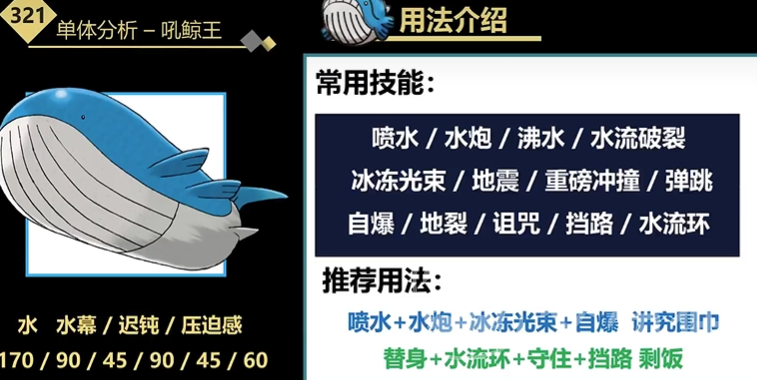 吼鲸王的技能主要是喷水、水炮、暴风雪、重磅冲撞、地震,这些技能都是爆发性的技能,可以让吼鲸王在战斗中造成高额的伤害,还可以起到一定的控制效果,双重打击是吼鲸王的特点之一,暴风雪可以让敌人有一定几率进入冰冻状态,起到控制效果,地震可以让敌人进入害怕状态,可以削弱敌人的攻击和速度,搭配着水炮技能和重磅冲击的高伤害有时可以直接秒杀敌人,这种搭配非常适合在战斗中使用。
