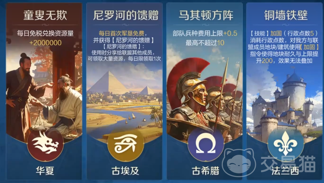 在S3赛季中,不同文明的特性再次得到了强化与更新。例如,华夏文明在火器时代新增的“童叟无欺”特性让资源获取更加便捷,而古希腊的“马其顿方阵”特性则提高了战斗中的兵种费用上限,增强了文明的作战能力。每个文明根据不同历史时代都有了更加独特的特性,这一改动让玩家在策略选择上有了更大的灵活性,也为不同的游戏流派带来了更多的可能性。
