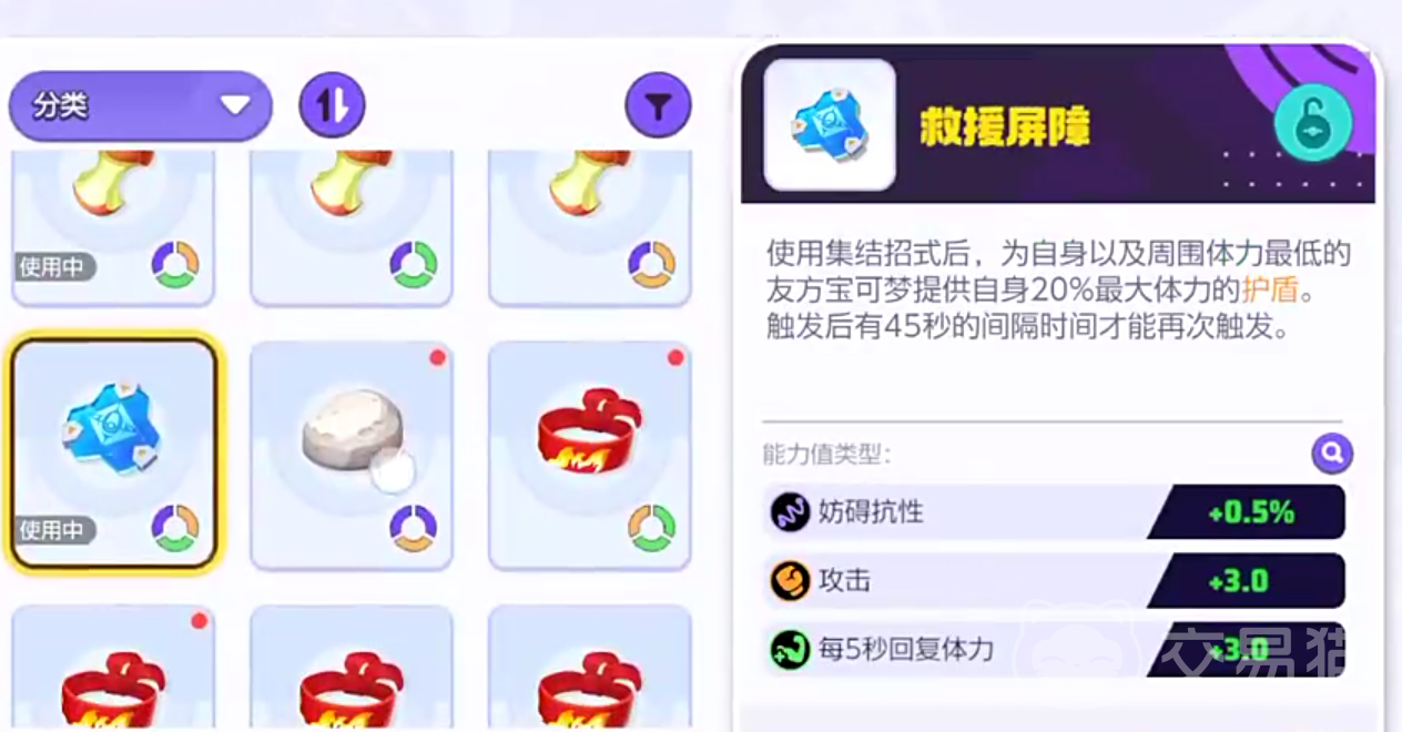 想要更好的发挥这个被动技,首先在持有物方面我们可以选择救援屏障或贝壳风铃,援助屏障能在角色使用集结招式后为自身和周围体力最低的宝可梦提供一个护盾,这样就能很好在被动技触发后很好的保护自身与一位队友,打出更高的伤害。